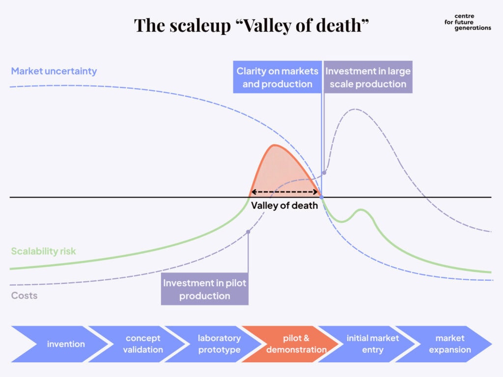 As shown in Figure 1, this stage – the ‘scale-up valley of death’ – is marked by steep rises in investment requirements and process uncertainty (scalability risk) before stabilising once manufacturing systems mature. Europe should act as an enabler at this point, expanding access to shared pilot and demonstration infrastructures and streamlining regulatory processes to de-risk scale-up.